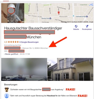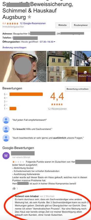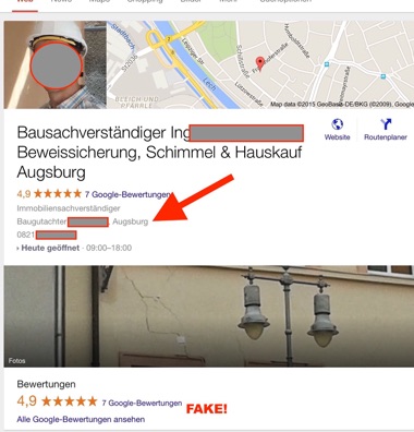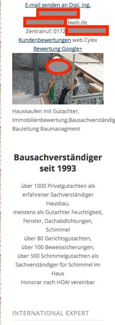 An dieser Stelle muss ich, bevor alle ehrenwerten Kollegen einen dunklen Schatten abgekommen, deutlich schreiben, dass solch Vorgehensweise nicht die eines zuverlässigen und aufrichtigen Sachverständigenkollegen ist. Vertrauenswürdige Sachverständige haben solch dubiose Werbung nicht nötig. Wir werben mit Fachkenntnis, vielleicht mit Bildern von Bauschäden und mit Aufklärung. Ganz sicher hat auch jeder ehrenwerte Kollege es nicht nötig mit eigenem Gesicht und fremden Namen zu werben, denn Authentizität ist in unserem Beruf mindestens ebenso wichtig wie die Fachkenntnis.