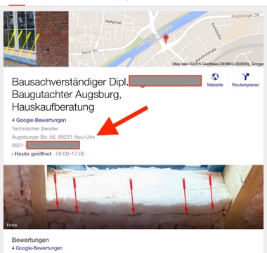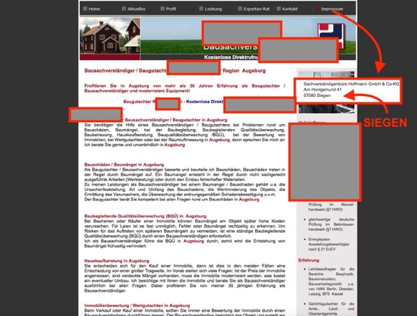 ... und die Trittbrettfahrer kommen auch zutage, hier ein Sachverständigenbüro aus Siegen, das sich als augsburger Sachverständigenbüro ausgibt (auch hierzu gibt es Seiten mit „Baugutachter in Aichach“, „Baugutachter in Friedberg“, „Baugutachter in Stuttgart“, „Baugutachter in München“ etc. pp, ergo exakt die gleiche Masche wie auch bei Herrn ABC) und der Sachverständige selbst wirbt ganz nebenbei als öffentlich bestellter und vereidigter Sachverständiger. Zwei Dinge, die so gar nicht gehen: a) er präsentiert Werbelügen indem er sich als regional augsburger Sachverständiger ausgibt, b) er wirbt mit reklameähnlicher Werbung, was wiederum die Sachverständigenordnung für öffentlich bestellte und vereidigte Kollegen direkt untersagt. Doppelter Abmahngrund und auch irgendwie eine Schande für jeden vereidigten Kollegen. Ein Blick ins Impressum lohnt sich eigentlich immer.
