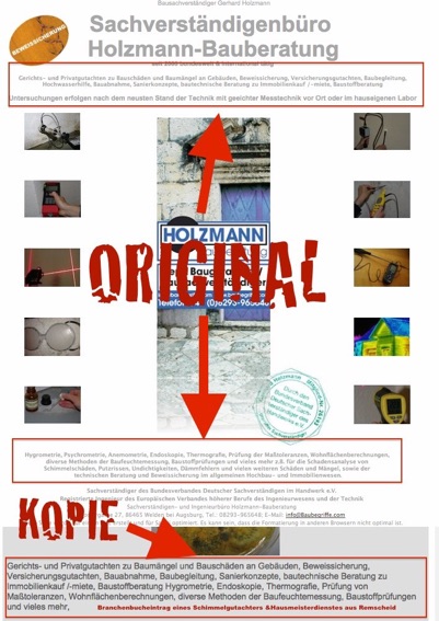 Sachverständigenwerbung kann auch einfach nur Kopie sein. Viele sogenannte und/oder selbsternannte Webdesigner ramschen sich aus dem „Netz“ zusammen, was sich andere mit mehr oder weniger großem Erfolg schon einmal ausdachten und verkaufen dies dann als eigene „Erfindung“. Hier (Bild oberhalb) kopierte vor einigen Jahren ein  Hausmeisterdienst und Schimmelpilzgutachter (sic!) aus Remscheid (Bergisches Land) einfach mal Textpassagen von unserer Internetseite. Welch ein Schimmelkiller, mag man denken. Häufig kommen zusätzlich die Worte Holz, Bauberatung, Baubegriffe und ähnliches auf der ansonsten gehaltsfreien Internetseite. Es wird mit Zertifikaten geworben, die Berufserfahrung und können spiegeln sollten aber eine Berufsbezeichnung, eine die ein echtes Studium oder auch nur eine Berufsausbildung im Sinne des Dualen Systems darstellt, ist nicht zu finden. Tolle Grafik und viele Werbephrasen anderer Internetseiten täuschen einen Fachmann vor, der hier nicht zu finden ist, sich noch nicht einmal mit eigenen Worten bewerben kann. Selbst die fachlichen Grundlagen mit denen er sich als Fachmann publiziert sind von anderen Seiten 1:1 kopiert. Letztlich sind gar programmierte Rechenprogramme zum Lüften u.ä. auffindbar, die jedoch dilettantischer kaum sein könnten und weit weg vom reellen ingenieurtechnischen Berechnen solcher Problemfälle liegen. Kompletiert wird solch Unfug dann auch noch mit einem Sachverständigenregister, zu welchem man eine ganze Menge an Kollegen im Schein eines kostenfreien Branchenbuches aufnimmt. Womit wohl? Natürlich, dass man auch gefunden wird, wenn man die Namen der Kollegen in der Suchmaschine sucht und damit nach außen auch wieder als anerkannt und bekannt glänzt. Ähnliches Prinzip also wie die Expertengruppe um und mit dem Herr „ABC“. Alles glanzvolle Bauexperten also.