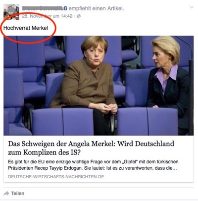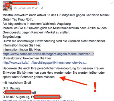 Apropos Politik - Herr „ABC“ beschuldigt die Bundeskanzlerin Angela Merkel des Hochverrats (Screenshot eines seiner Facebookkommentare). Andere Kommentare des Herrn in diversen Sozialen Netzwerken sind deutlichst von rassistischem Inhalt geprägt. Er beschuldigt nicht nur die Bundekanzlerin mehrfach des Hochverrats ebenso kündigt er an, dass es Bürgerkrieg geben wird. Der Vizepräsidentin des Deutschen Bundestages Frau Claudia Roth droht er gar mit Schmerzen! Welch Niveau... passt aber zu den Dingen die Sie hier noch in rot lesen werden.