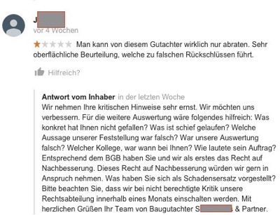 Nach einer Beschwerde wird auf einen Obergutachter vom Gericht bezogen und natürlich haben alle andere Meinungen. Am Ende wird dem Kunden noch indirekt der „Bock“ zugeschoben, dass er das Haus alleine gekauft und dabei kein Gutachten erstellt hat. Das begründet natürlich alles....
