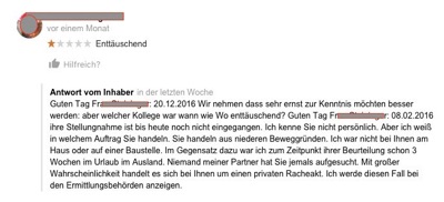 Wer nicht postitiv bewertet, dem wird gleich mal gedroht. Wie passsend von einem Menschen der der Kanzlerin Hochverrat anhängt, Menschen vermutlich vor deren Häusern nachstellen lässt, mit „muslimischen Freunden“ droht, nach Erfahrungsberichten Dritter Kunden bar ohne Rechnung abkassiert, aufrichtige Kollegen offenbar hinterrücks schlechtredet, mit falschen Bewertungen im Internet wirbt, sich gar selbst unter eigenem Namen bewertet , hunderte von  Firmenadressen vorgibt zu haben aber vermutlich noch nicht einmal eine legitime Geschäftsform angemeldet hat, womöglich zu denjenigen gehören, die sich über die soziale Lage im Land erregen aber großzügig Steuern hinterziehen und somit selbst überhaupt nichts für die Allgemeinheit bewegen...